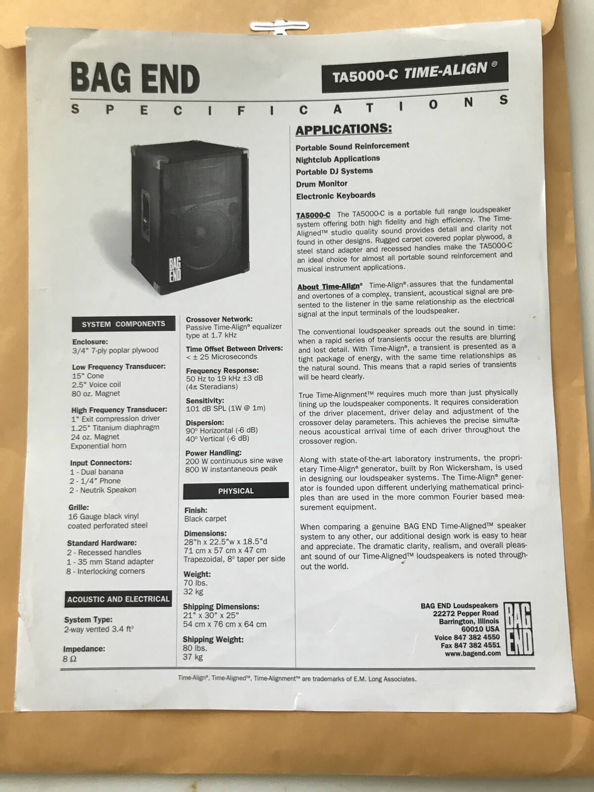 Bag End Bagend Ta5000 Ta5000 C Speaker Monitor Specifications Page Dealer Sheet Ebay